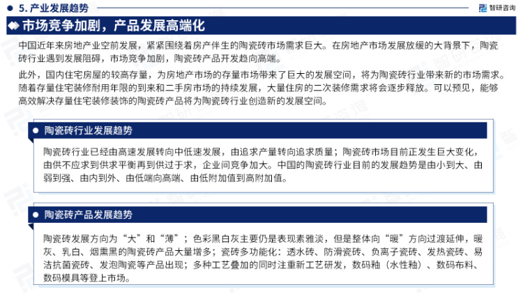 中国近年来房地产业空前发展,紧紧围绕着房产伴生的陶瓷砖市场需求巨大。在房地产市场发展放缓的大背景下,陶瓷砖行业遇到发展阻碍,市场竞争加剧,陶瓷砖产品开发趋向高端。