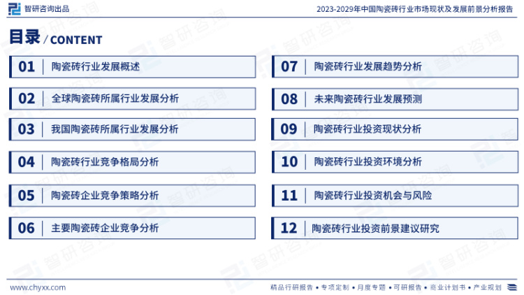 《2023-2029年中国陶瓷砖行业市场现状及发展前景分析报告》是智研咨询重要成果,是智研咨询引领行业变革、寄情行业、践行使命的有力体现,更是陶瓷砖领域从业者把脉行业不可或缺的重要工具。智研咨询已经形成一套完整、立体的智库体系,多年来服务政府、企业、金融机构等,提供科技、咨询、教育、生态、资本等服务。