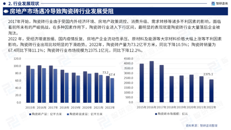 2022 年,受经济增速放缓、国内疫情反复、房地产企业流动性承压、原材料及能源等大宗材料价格大幅上涨等不利因素影响,陶瓷砖行业出现比较明显的下滑趋势。2022年,陶瓷砖产量为73.2亿平方米,同比下降10.5%;陶瓷砖销量为67.4同比下降11.1%;陶瓷砖行业市场规模为2375.1亿元,同比下降12.2%。