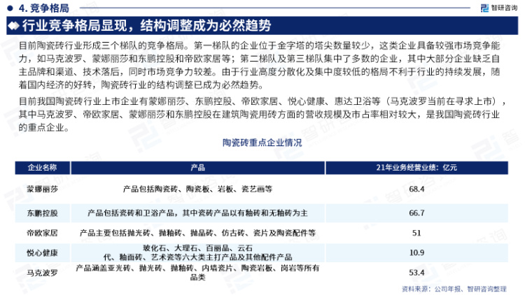 目前陶瓷砖行业形成三个梯队的竞争格局。第一梯队的企业位于金字塔的塔尖数量较少,这类企业具备较强市场竞争能力,如马克波罗、蒙娜丽莎和东鹏控股和帝欧家居等;第二梯队及第三梯队集中了多数的企业,其中大部分企业缺乏自主品牌和渠道、技术落后,同时市场竞争力较差。由于行业高度分散化及集中度较低的格局不利于行业的持续发展,随着国内经济的好转,陶瓷砖行业的结构调整已成为必然趋势。