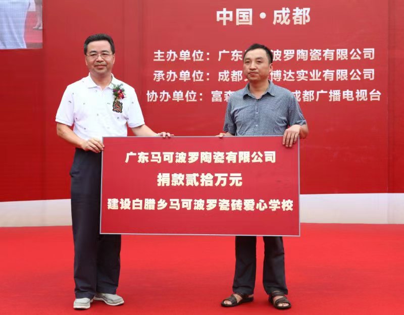 马可波罗控股董事长黄建平(左)代表公司出席公益活动(右为白腊乡乡长马兴明)。图片来源:马可波罗瓷砖