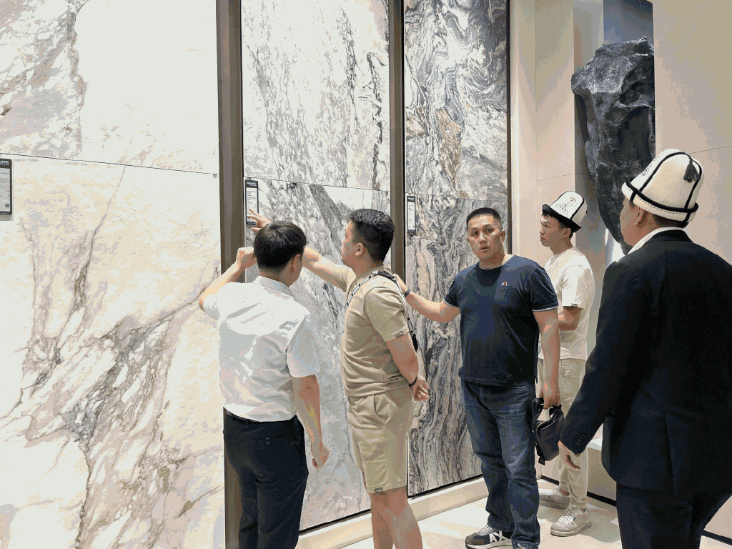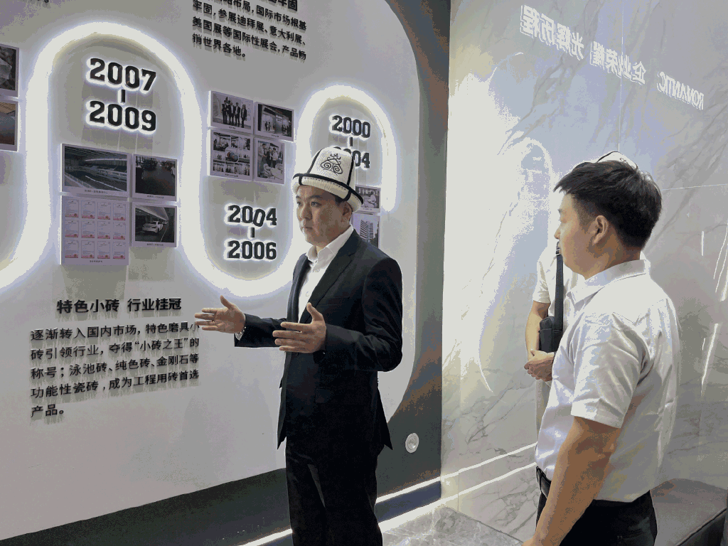 在参观的过程中,率先向吉尔吉斯斯坦代理商及考察团详细讲解品牌发展史,就深耕行业23年的发展历程、品牌实力、产品矩阵等内容作详细的分享,让吉尔吉斯斯坦代理商及考察团对罗曼缔克瓷砖有了更深入的了解。