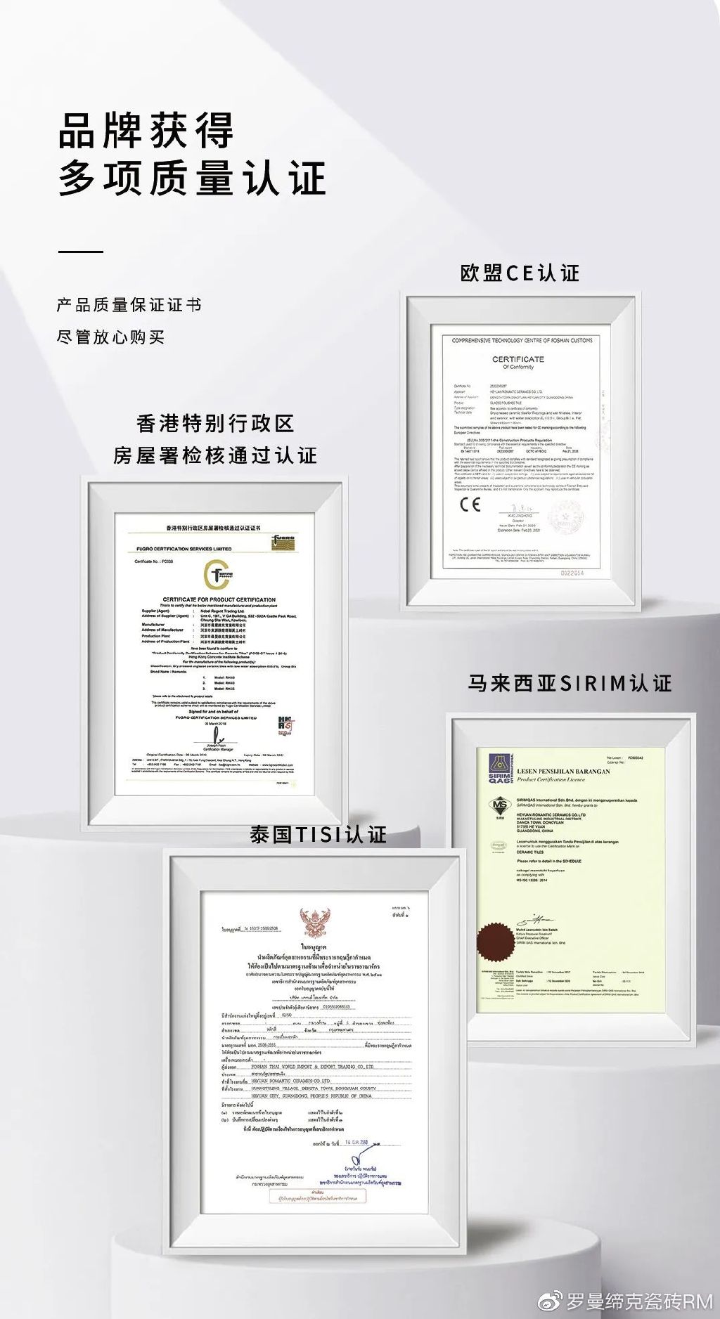 作为行业特色瓷砖的领导品牌,罗曼缔克瓷砖对特色瓷砖的研发与生产,已得到不少国内外贸易商的认可与支持。早在2015年,ROMANTIC就通过了香港特别行政区房屋署检核通过认证及欧盟CE产品质量认证;又在2017年先后通过马来西亚SIRIM认证及泰国TISI认证;