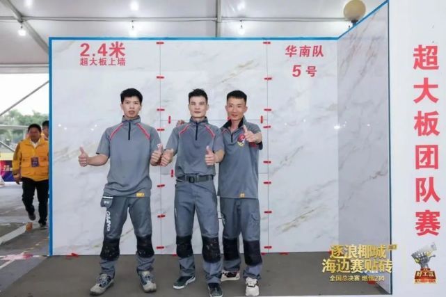 本次大赛高手云集,汇聚了全国各区域的优秀代表队同台竞技。大板团队赛的比赛时长为2小时,赛题1:1还原了工地现场,在1200mm*2400mm的超大板上墙铺贴,极度考验选手的综合技术应用能力,对于平时少有接触大板铺贴的李启勇老师来说无疑是不小的挑战。李启勇老师迎难而上,凭借多年的比赛经验和扎实的工艺技能,综合实际场景和施工质量指标要求,在比赛中与其他两位队友默契配合,各展所长,最终获得了全国总决赛的季军。