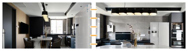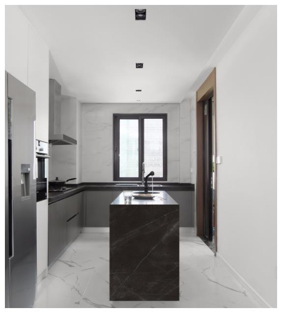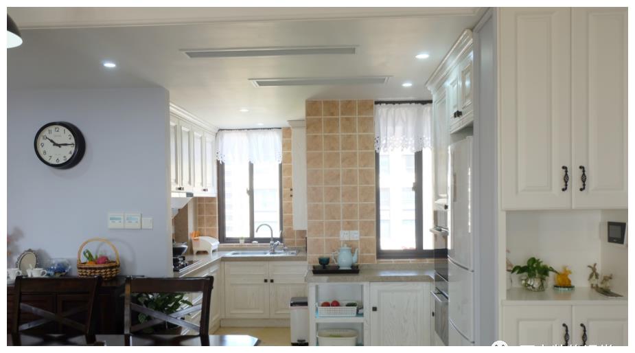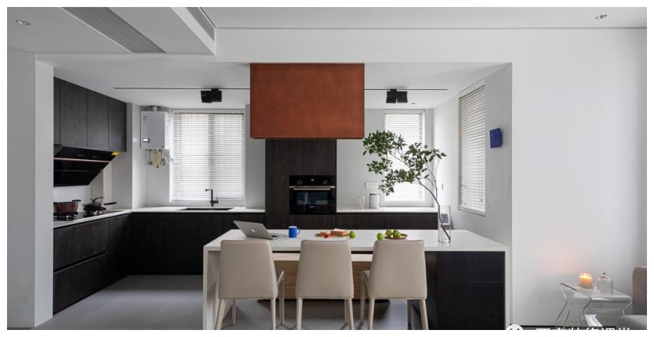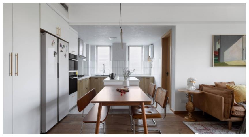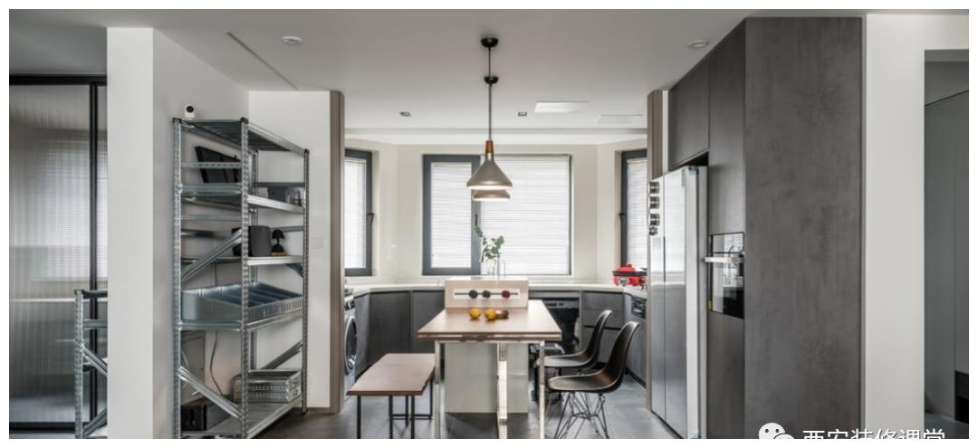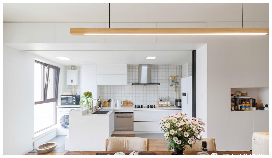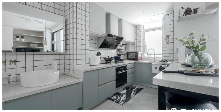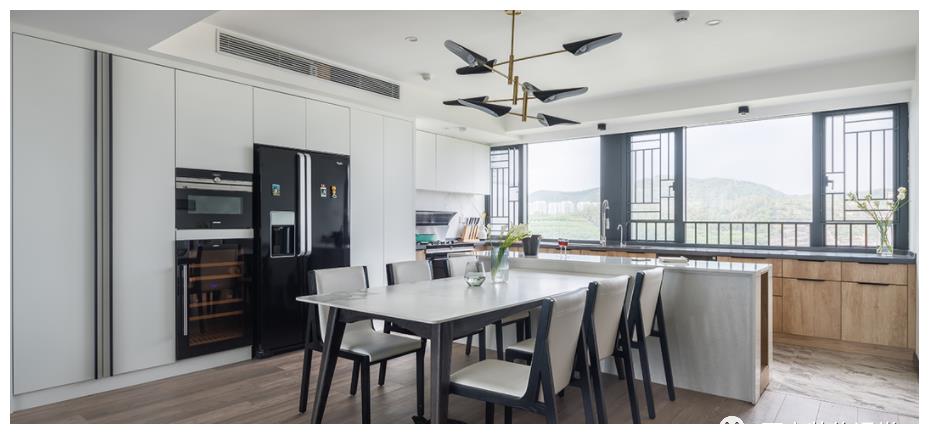 ▲像这种面积很大的开放式餐厨一体空间,大面积窗户无法铺砖,只在造型背景铺贴瓷砖即可,刚好利用高柜进行收口处理