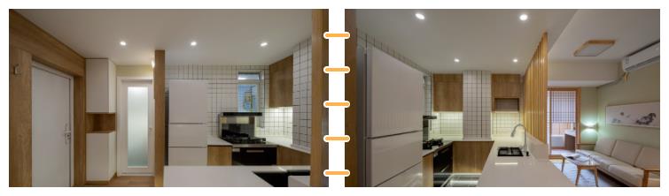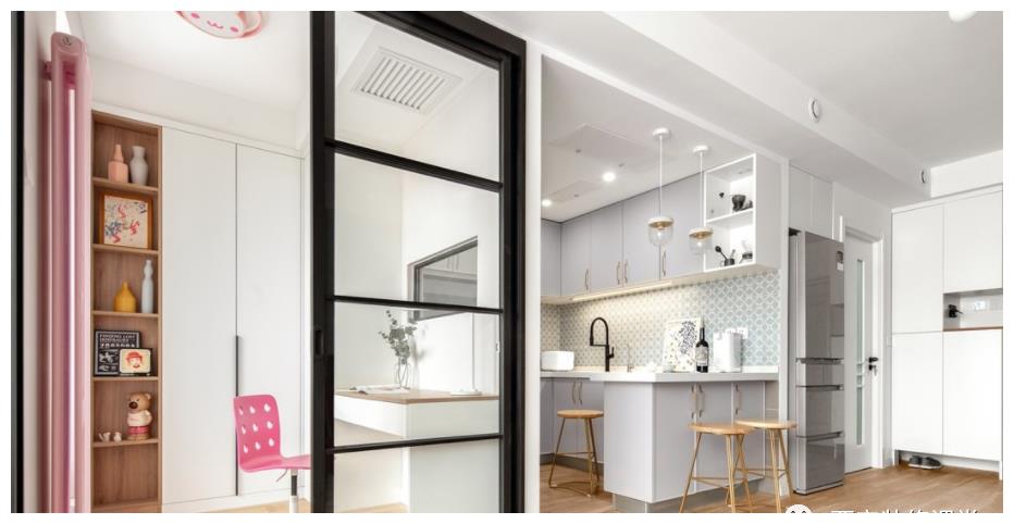 ▲开放式厨房,进门直对新砌墙满足进门玄关同时满足瓷砖收口;右侧台面抬高,利用木质格栅分割空间,同时满足瓷砖收口需求