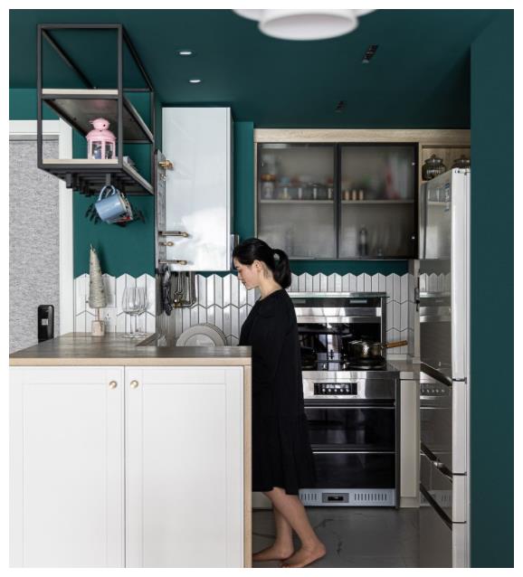 ▲很小的开放厨房,统一半截墙瓷砖与墨绿色防水漆搭配,刚好左侧利用门套收口,右侧墙解决瓷砖收口问题