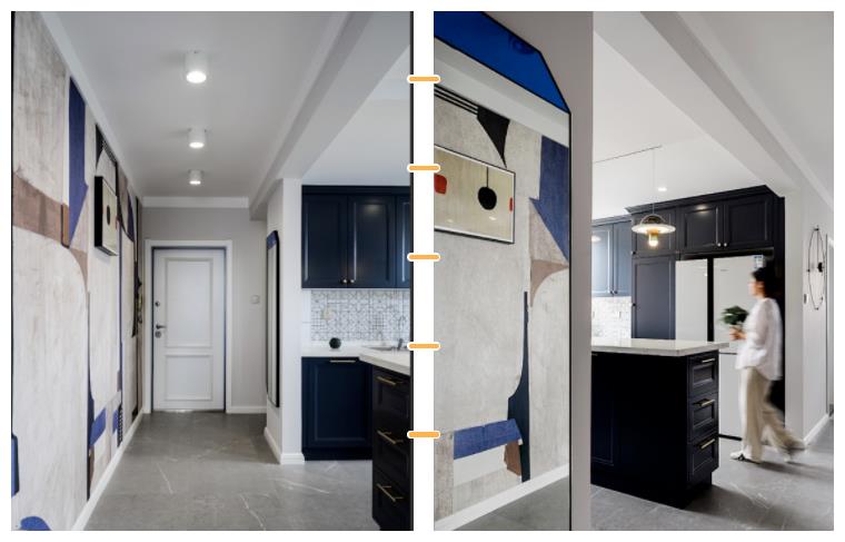 开放式处理,入户门口刚好凹陷区收口,右侧冰箱处无法收口,采用新砌墙的方式满足瓷砖铺贴的完美收口