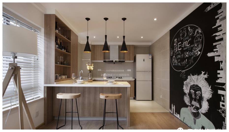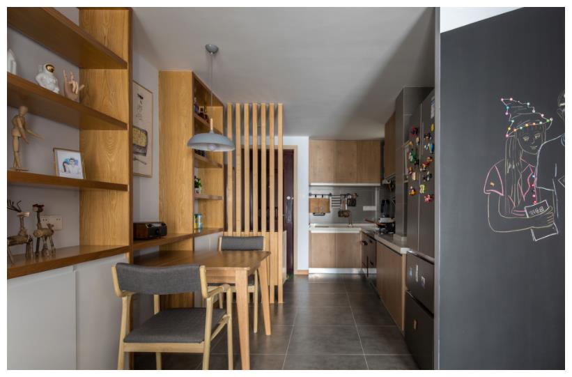 ▲左侧高柜收口,右侧黑板漆装饰,解决瓷砖无法收口的视觉突兀问题