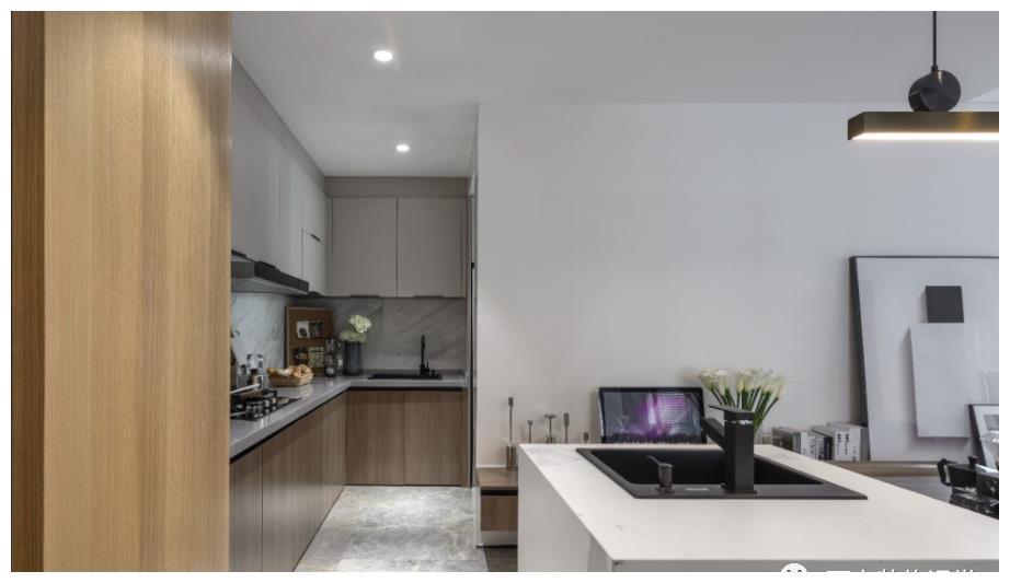▲彻底开放式厨房,打通以后餐厨一体;左手不铺砖,采用木质饰面装饰,而且悬挂电视,方便就餐时观看;L型瓷砖铺贴,右手采用高柜进行瓷砖收口处理