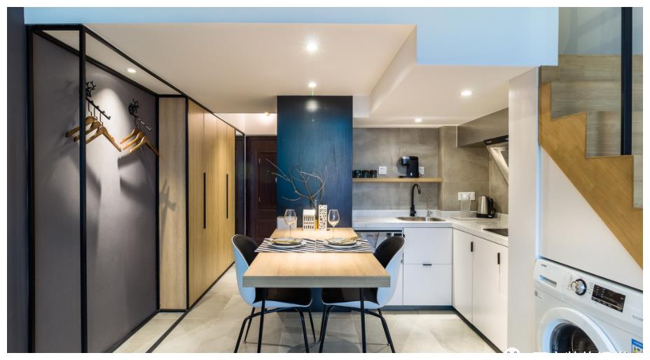 ▲复式房的开放式厨房,延伸吧台餐桌,采用局部木质饰面装饰收口,右侧楼梯拐角刚好瓷砖收口,L型橱柜与瓷砖完美契合