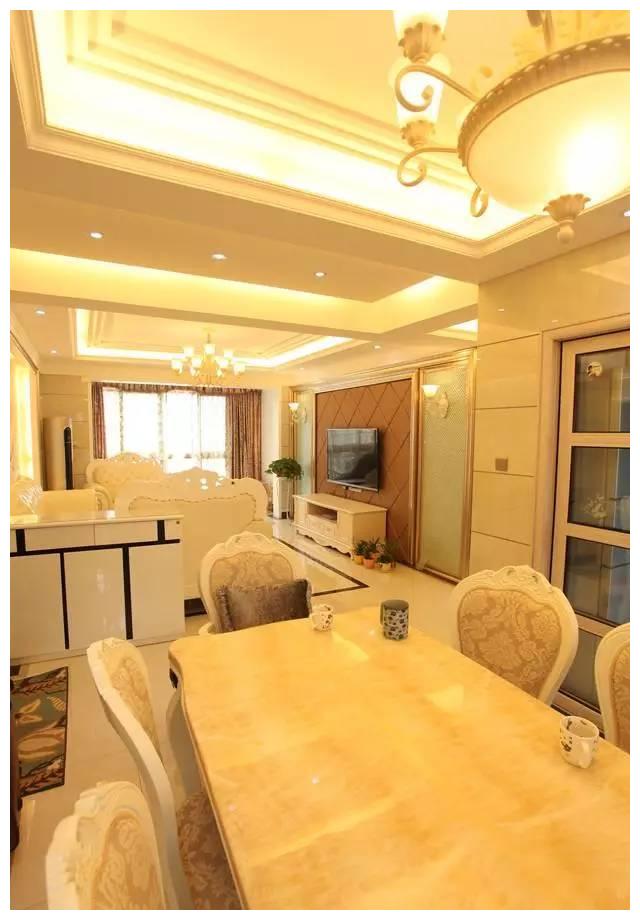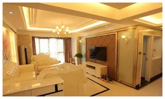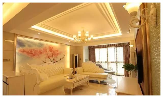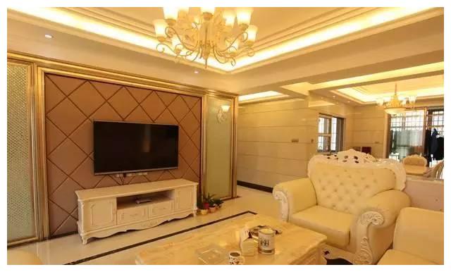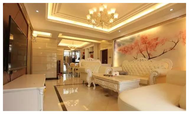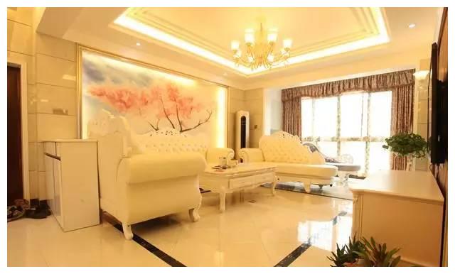 先看客厅,背景是花开富贵,但是比较现代清新的那种,不是牡丹,感觉还不错。家具都是简欧风格的,比较大气,镇得住。
