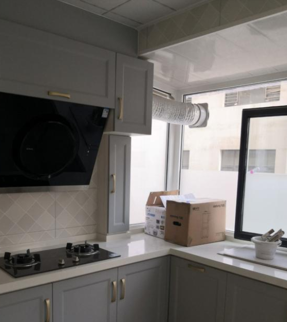 厨房则打造了U型的橱柜,橱柜的颜色以灰色为主,搭配白色的台面石,看起来干净整洁。