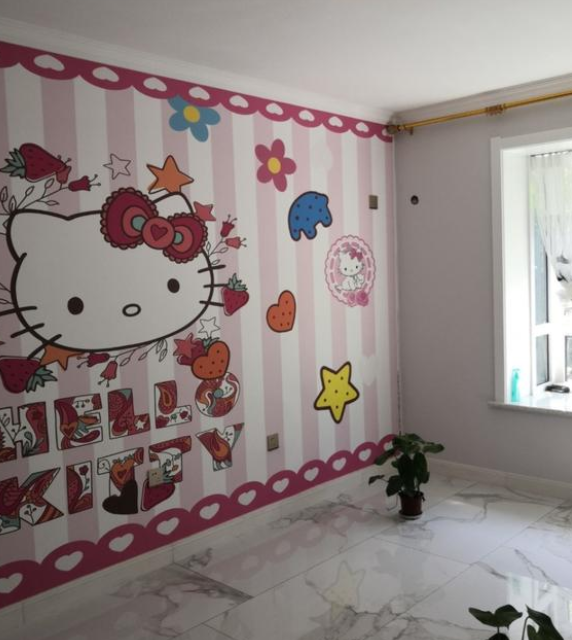 女儿的房间则贴了墙布,用的是凯蒂猫的图案作为装饰,满满的少女心,每个女孩都喜欢的,飘窗使室内的采光更加足,还能当休闲空间使用。