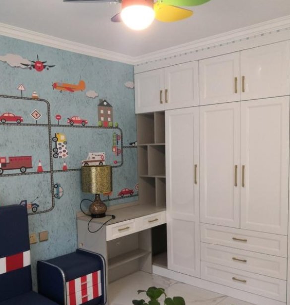 儿子的房间贴了墙布,相当的有童趣,书桌跟书柜连接着衣柜,非常的省空间,天花板上装了五色风扇灯,能纳凉也能增加照明。