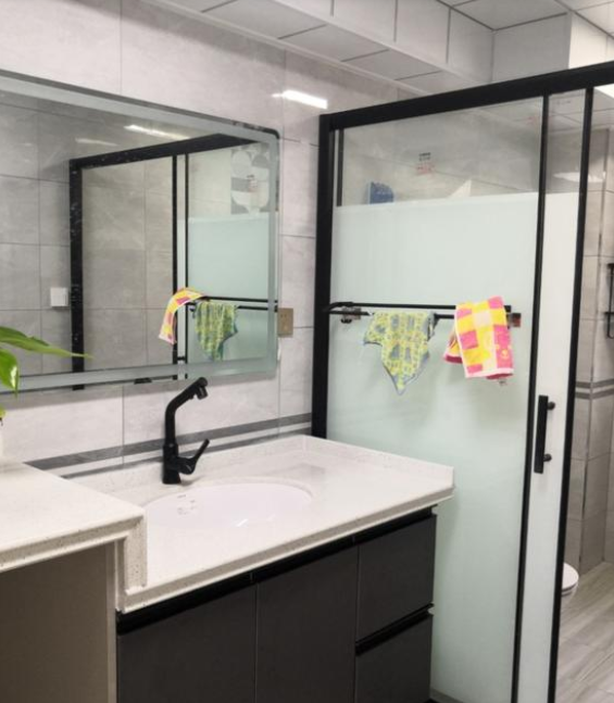 卫生间干湿分离,洗手台旁边还装了个可以放洗衣机的柜子,好看又很实用。