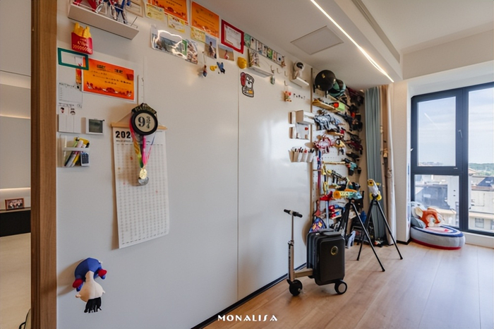 地面通铺蒙娜丽莎瓷砖轻奢素石系列纳维亚灰瓷砖,细腻的灰白色彩交织自然纹理,如同岁月沉淀的稳重,承托着二人对生活的期待。耐磨抗造的瓷砖地面成为孩子的游乐场,电动遥控车、滑板、桌游都能尽情施展,家人互动毫无顾忌。