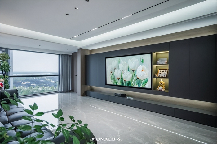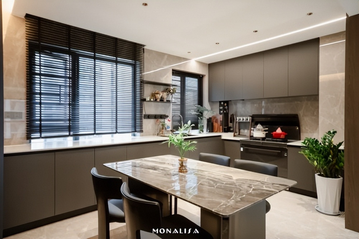 地面通铺蒙娜丽莎瓷砖的伊朗灰75-150FMB10237PM大砖,浅灰为底、点缀错落米白细纹的瓷砖,低调中流露奢华,以地砖连接起客厅、餐厅、厨房等所有公共区域,形成自然流畅的互动空间。无主灯的灯光系统设计,使亮光砖面也能反射出柔和光感,恰到好处的光影巧妙地中和深木色墙面的沉静,为家带来通透感与呼吸感。